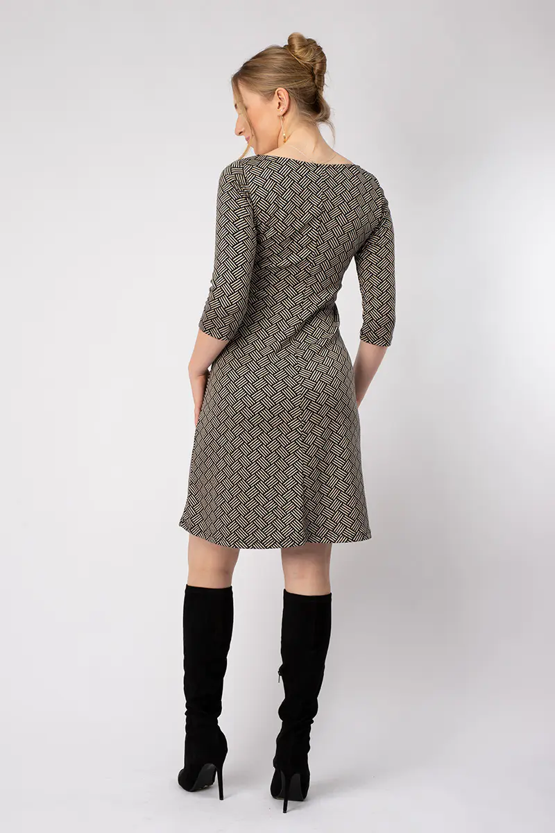 Kleid AUDREY zeichnet sich durch einen geradlinigen Schnitt in leichter A-Form aus. Der Halsausschnitt ist oval mit einem dekorativen „V“ in der Mitte.