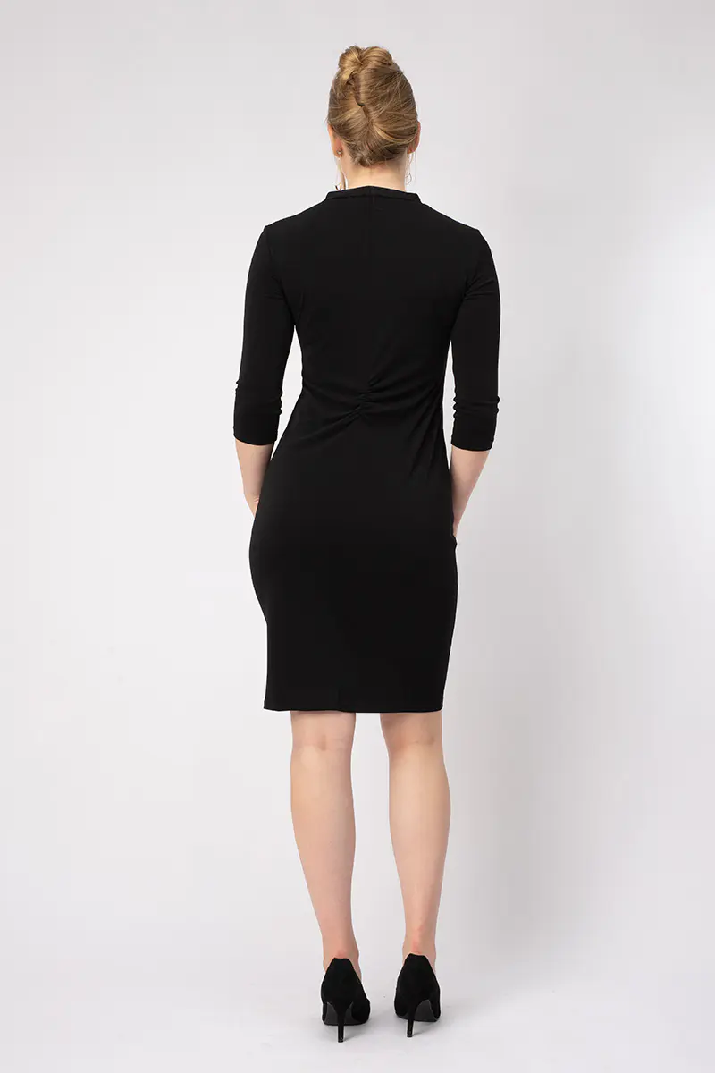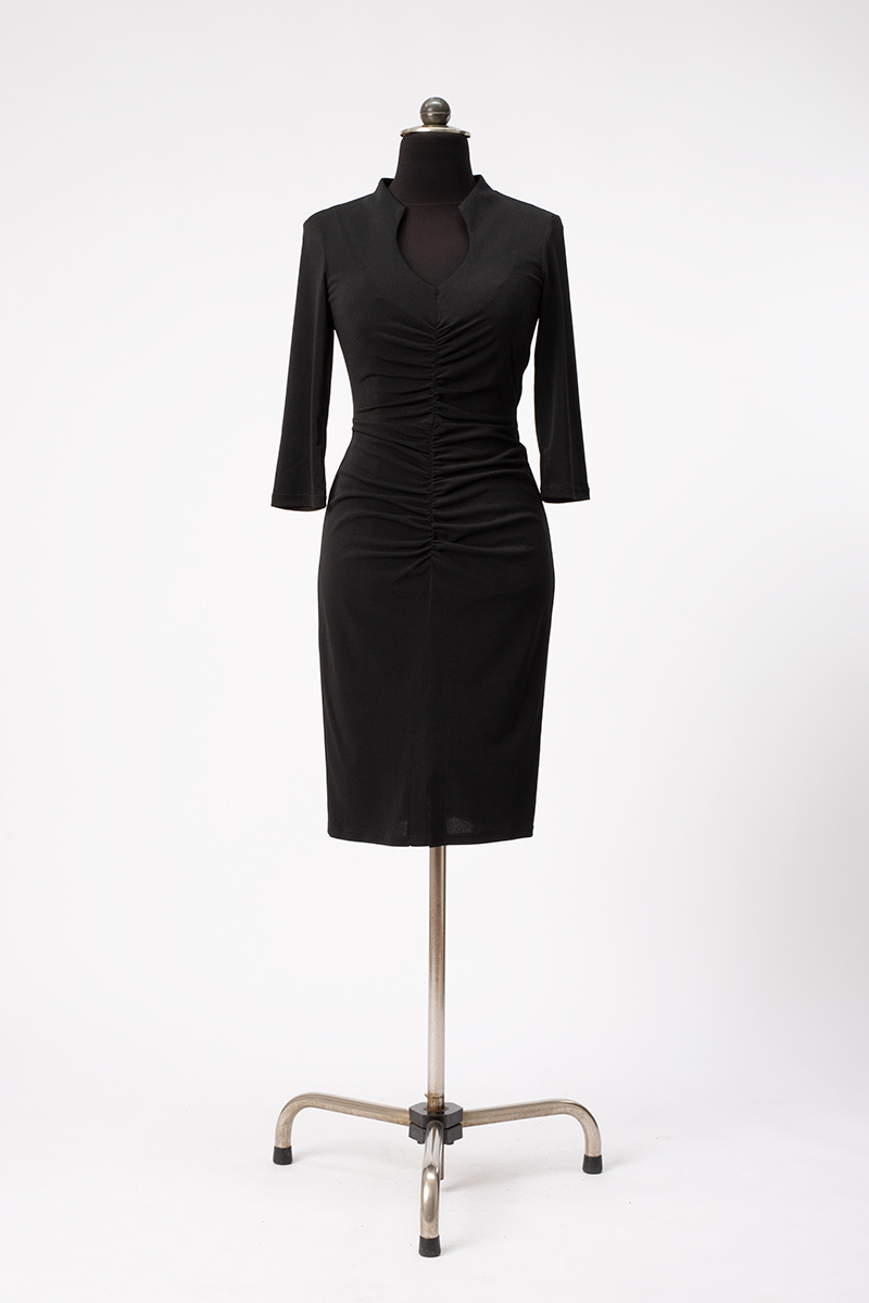 Es ist figurbetont aber nicht hauteng. Die Raffung im Vorderteil kaschiert gekonnt die eine oder andere weiblichen Rundung. Der Rock ist schmal und hat vorne einen Schlitz.